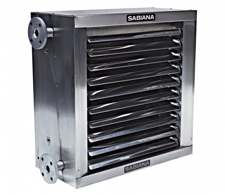 Teplovzdušné jednotky AIX s nerezovým opláštěním pro parní soustavy s přetlakem syté páry až 18 barů a horkovodní aplikace s teplotou topné vody až 210 °C.