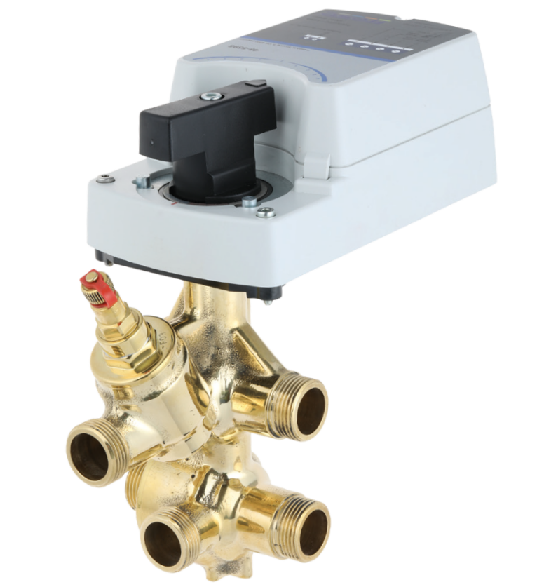 Kulový kohout s ovládacím pohonem se spojitým řízením 0–10 V slouží jak pro přepínání režimu topení / chlazení, tak pro spojitou regulaci výkonu připojeného spotřebiče.