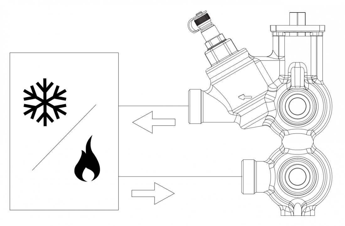 Tlakově nezávislý 6-cestný kulový kohout Combiflow použitý pro přepínání režimu topení / chlazení, nastavení maximálního průtoku okruhem spotřebiče v režimu topení i v režimu chlazení a regulaci výkonu spotřebiče